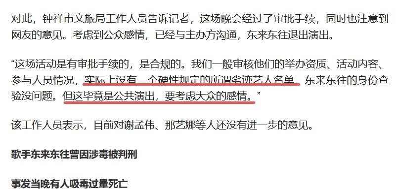 31. 同时也坦承,目前国家层面尚未建立统一明确的“劣迹艺人”禁止清单,因此仅从行政审核角度出发,邀请东来东往等人并不构成硬性违规。